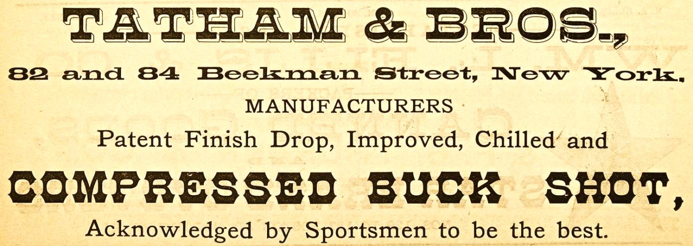 LEAD SHOT We manufacture drop and chilled shot in all standard sizes from .04" diameter to .23" diameter. We also manufacture compressed buck shot and lead balls ranging in diameter from .24" to .68". For air rifles, we make a special size of shot known and branded as "Air Rifle Shot." Having a diam- eter of .175", it is designed for most makes of air rifles. Sold under the brand name "Tatham, " our lead shot and lead balls are carefully manufac- tured to insure roundness, solidity, smooth polish and uniformity and accuracy as to size. Drop and chilled shot and lead balls normally are packed in 25 lb. bags. Air Rifle Shot is sold in large or small tubes, packed 100 to the case. The large tube contains approximately 4 ozs. of shot; the small tube approximately 2% ozs. Air Rifle Shot is also furnished in 1 lb. cartons, packed 25 cartons to the case.