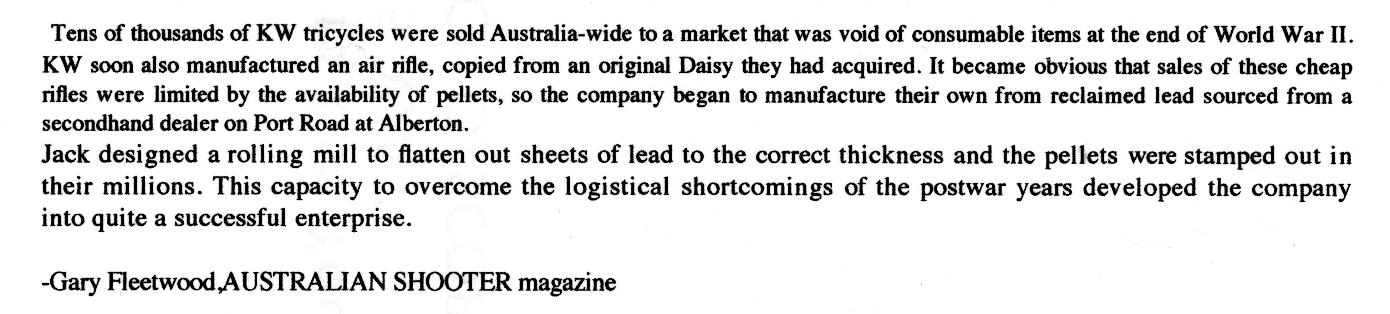 In the immediate post-WWII period Messrs Warne and Koch,two South Australians,set about making tricycles and bicycles for the local market.In due course they produced an airgun,a copy of a Daisy,which they named the "K & W". They even made their own brand of pellets-from recycled lead sheeting. Out of these beginnings the famous OZ firearms company,SPORTCO, was born.