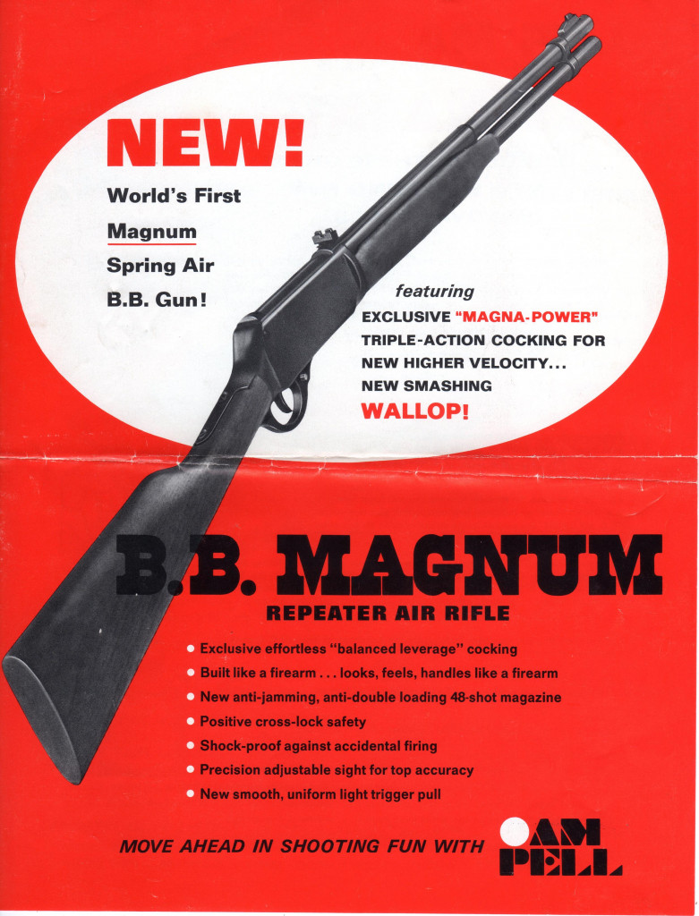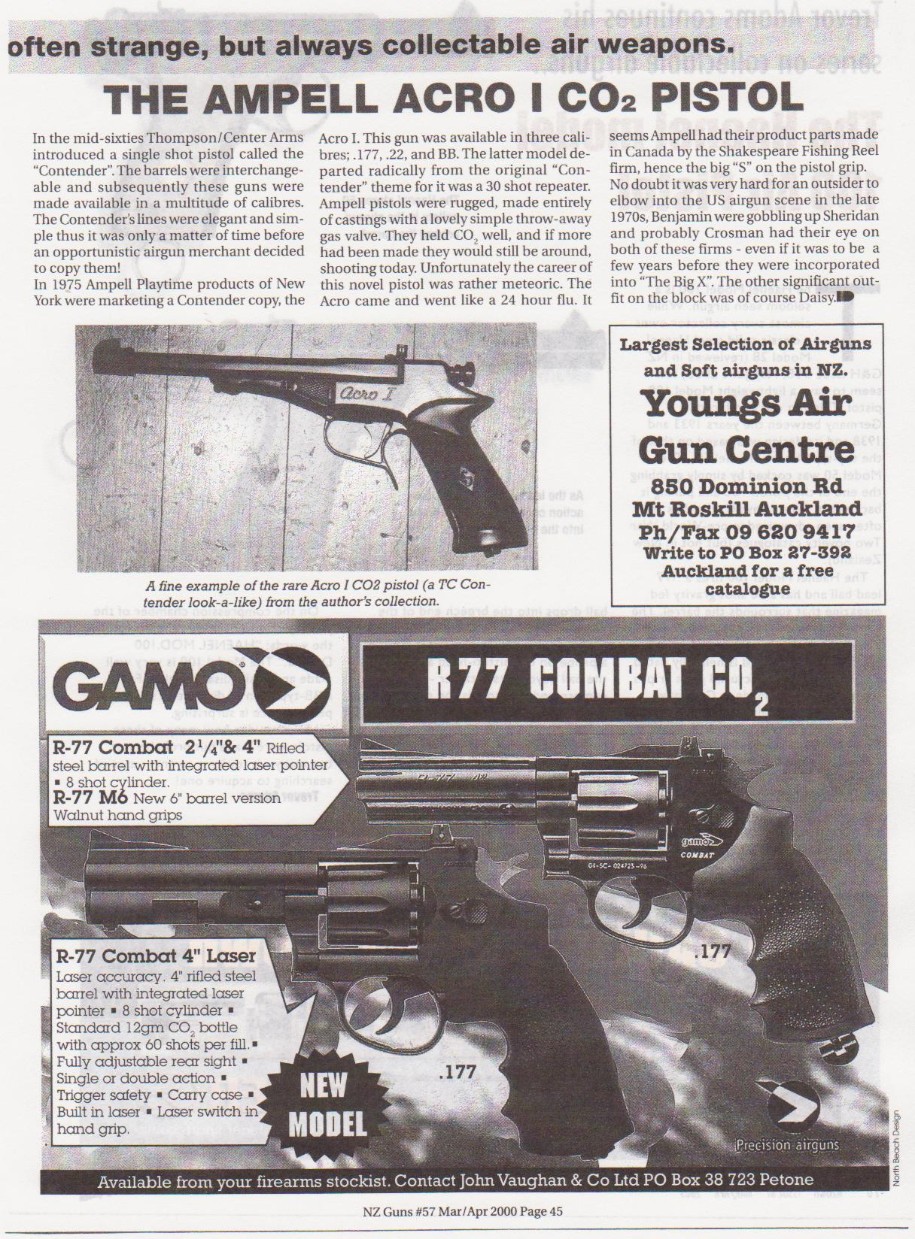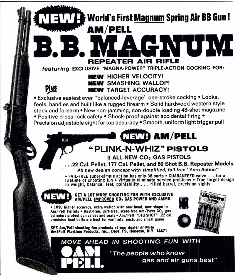 Circa 1971.As with the Crosman M1(circa 1968) the Ampell's compression tube was fitted with a poppet valve which only opened when the pressure in the tube reached an 'elevated level'-ensuring only highly compressed air was dumped behind a breeched BB round!