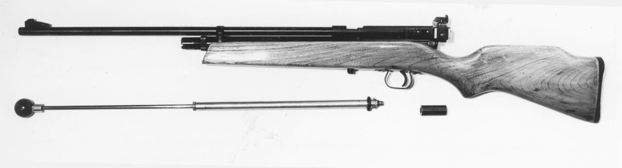 A youthful John Atkins demonstrates the correct way to pump a Crosman Model 160 pneumatic rifle with an 'Instantair' pump.