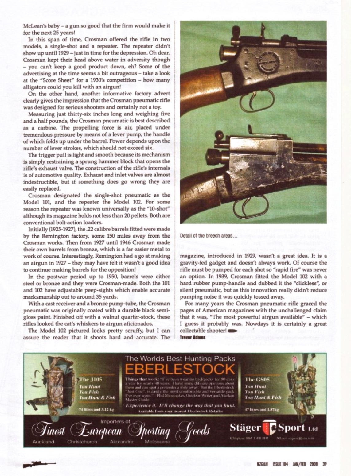 I had one of these rifles for some months, it worked as both a pneumatic and CO2 rifle. In the former mode it was rather 'labour intensive' but energy generated by pumping was adequate. I had it photographed and recorded all I knew about it in the March '86 'Air Gunner' magazine. I revisited the subject in a follow-up article at the end of the same year (Dec. '86) and included some facts regarding the gun's name-which came directly to me from Fred Diehn, the Director of Marketing for Crosman Airguns in a 'phone call he kindly made to me. He explained this "Ted Williams' marked Crosman Model 160 rifle was a project undertaken for Sear's retail and mail-order house.My sample was subsequently returned to Mr Alan Hamer (Manchester Air Guns) who eventually sold it. I recorded all details as accurately as I could after inspecting and testing the rifle. The Crosman 126 Match associated with an Instantair hand-pump is an efficient shooter when charged with either air or CO2. The pump's fitted and polished ball handle is well designed and moderately easy to use.Unlike many air cane front pumps the Instantair does not require pushing against a hard object-which is convenient. At time of writing two samples of this interesting outfit are known. John Atkins