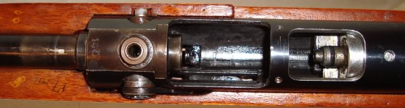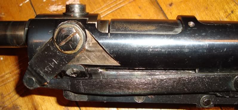 Top-wood removed and cocking arm retracted.The "snout"of the sliding cylinder has an "O" ring that seals against the side of the breech-end of the barrel.