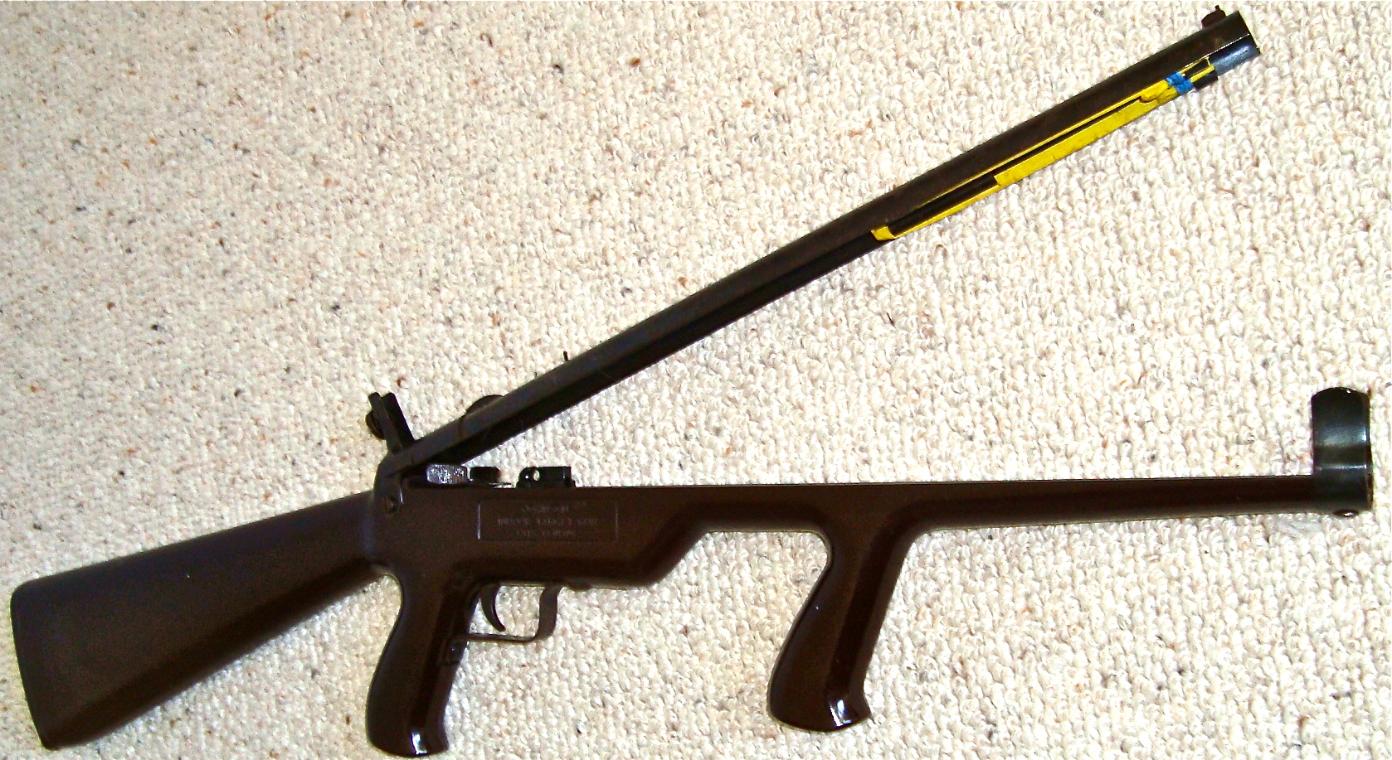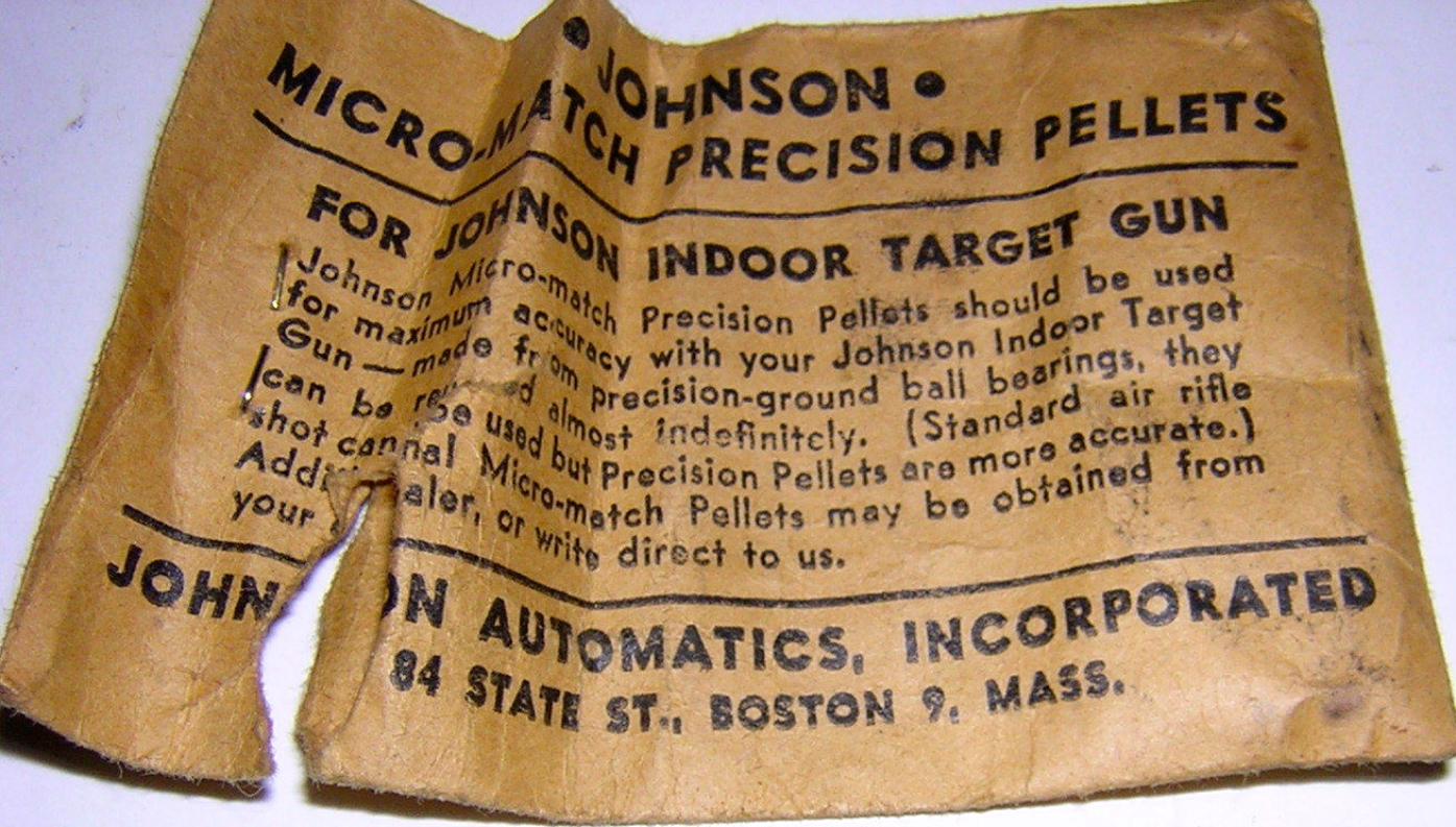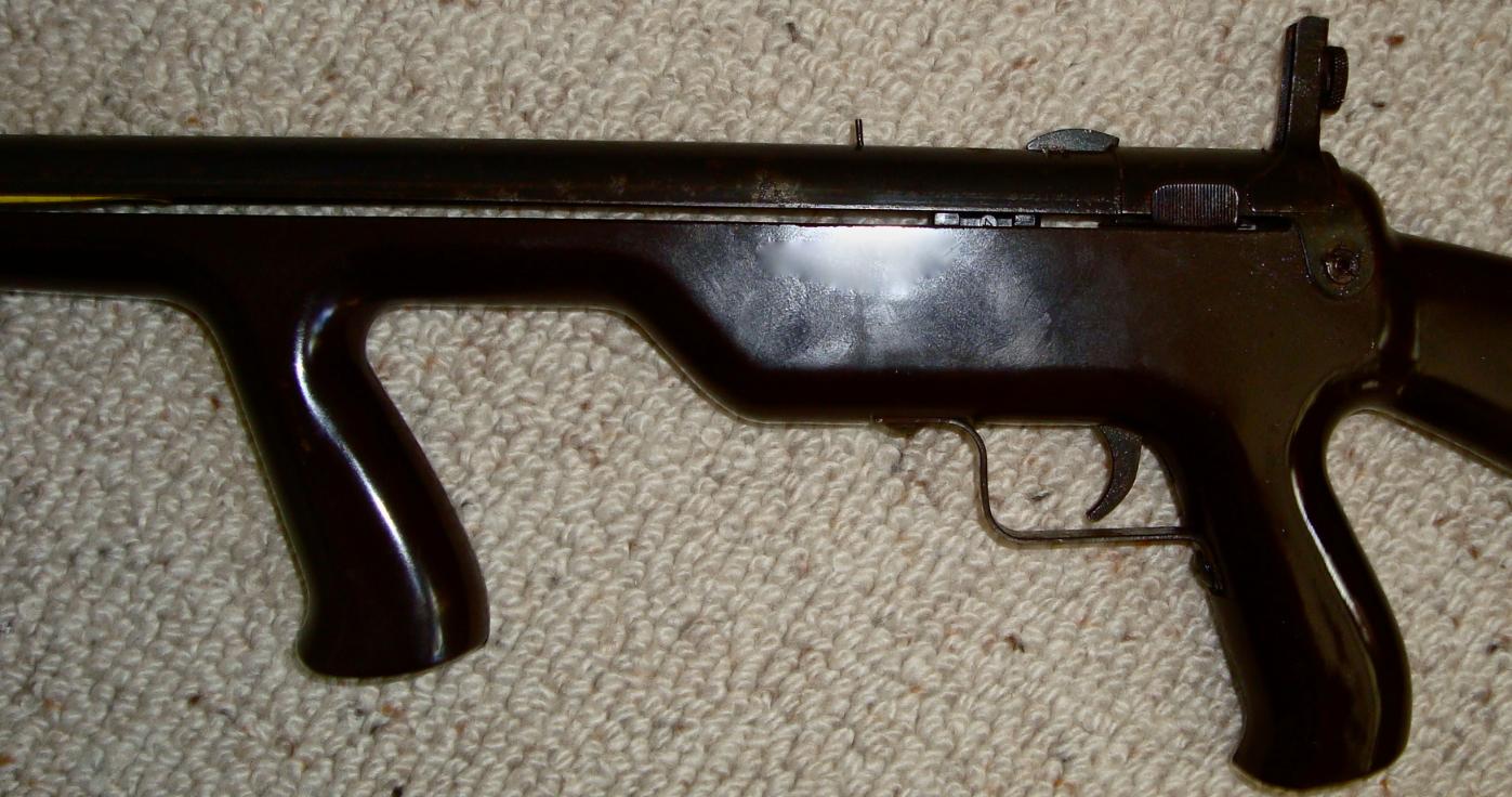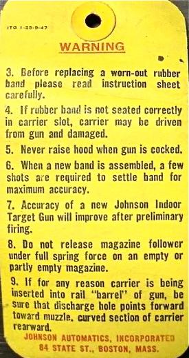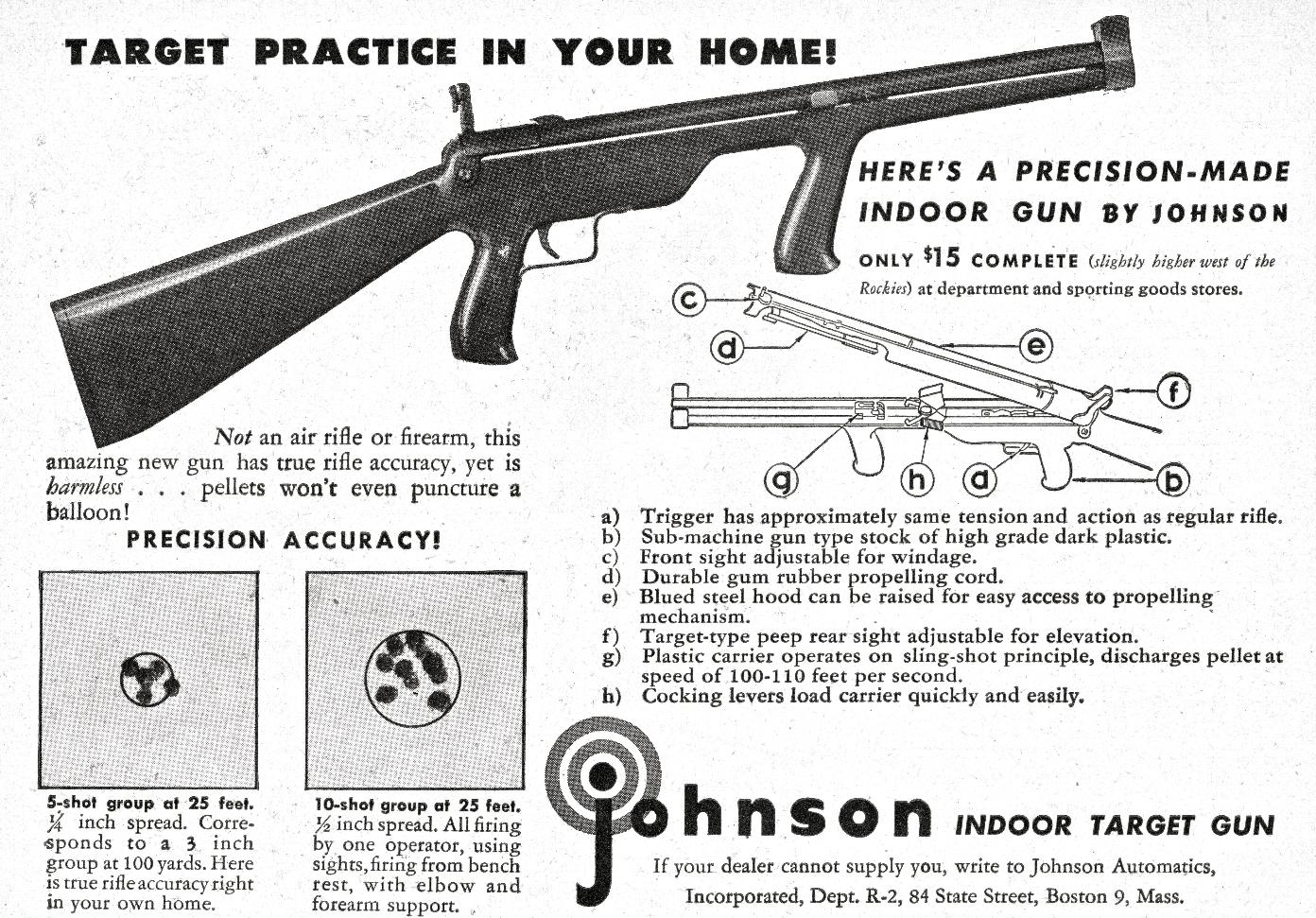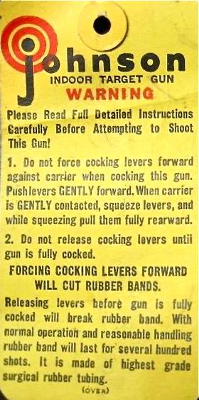 A product of the 1940's,the Johnson Indoor Target Gun is actually a BB slingshot. It fires standard steel air rifle shot with considerable accuracy at "living room" distances. The Johnson has no real barrel,the upper half of what appears to be a barrel contains a force-fed BB magazine. A large rubber-band,rather than a spring,supplies the necessary energy to launch a missile. Riding a rail,in the lower half of the apparent barrel,is a slide which firstly, engages a large rubberband mounted over it then when retracted,strips a BB from the magazine. Pulled rearward by a "quick release"cocking gadget,the slide engages the trigger sear. Once careful aim has been taken via the peep and post sighting system,a squeeze of the trigger releases the loaded slide, the big rubber-band contracts, tossing a BB out the business-end!