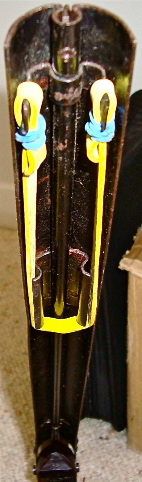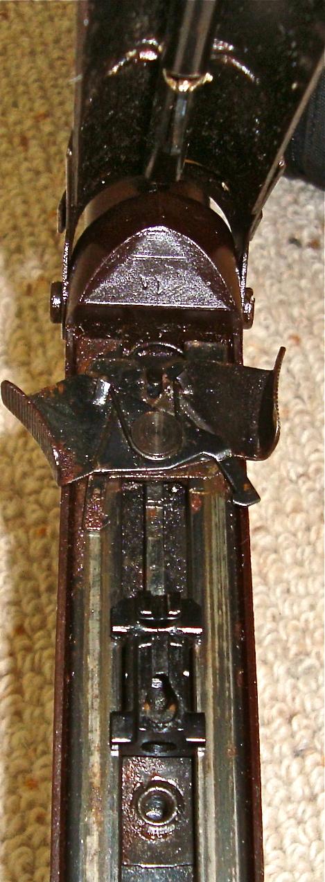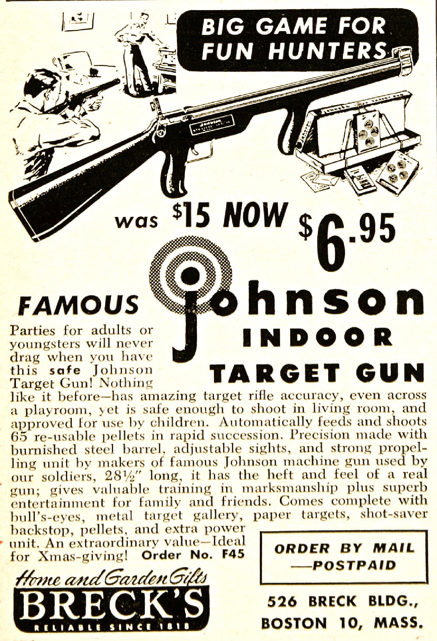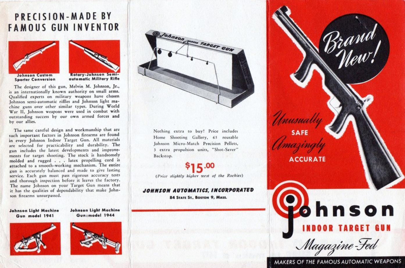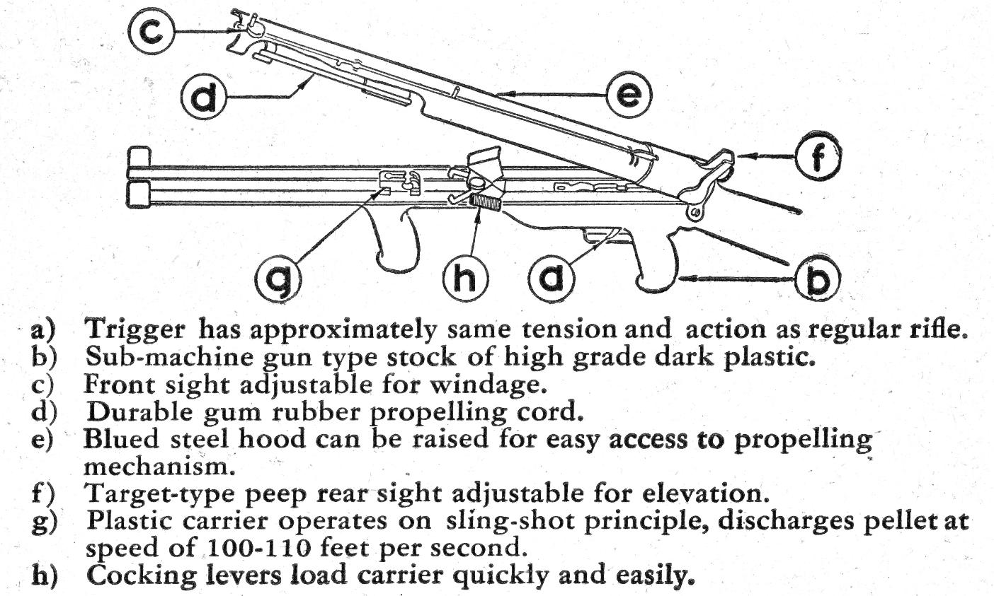 A product of the 1940's,the Johnson Indoor Target Gun is actually a BB slingshot. It fires standard steel air rifle shot with considerable accuracy at "living room" distances. The Johnson has no real barrel,the upper half of what appears to be a barrel contains a force-fed BB magazine. A large rubber-band,rather than a spring,supplies the necessary energy to launch a missile. Riding a rail,in the lower half of the apparent barrel,is a slide which firstly, engages a large rubberband mounted over it then when retracted,strips a BB from the magazine. Pulled rearward by a "quick release"cocking gadget,the slide engages the trigger sear. Once careful aim has been taken via the peep and post sighting system,a squeeze of the trigger releases the loaded slide, the big rubber-band contracts, tossing a BB out the business-end!